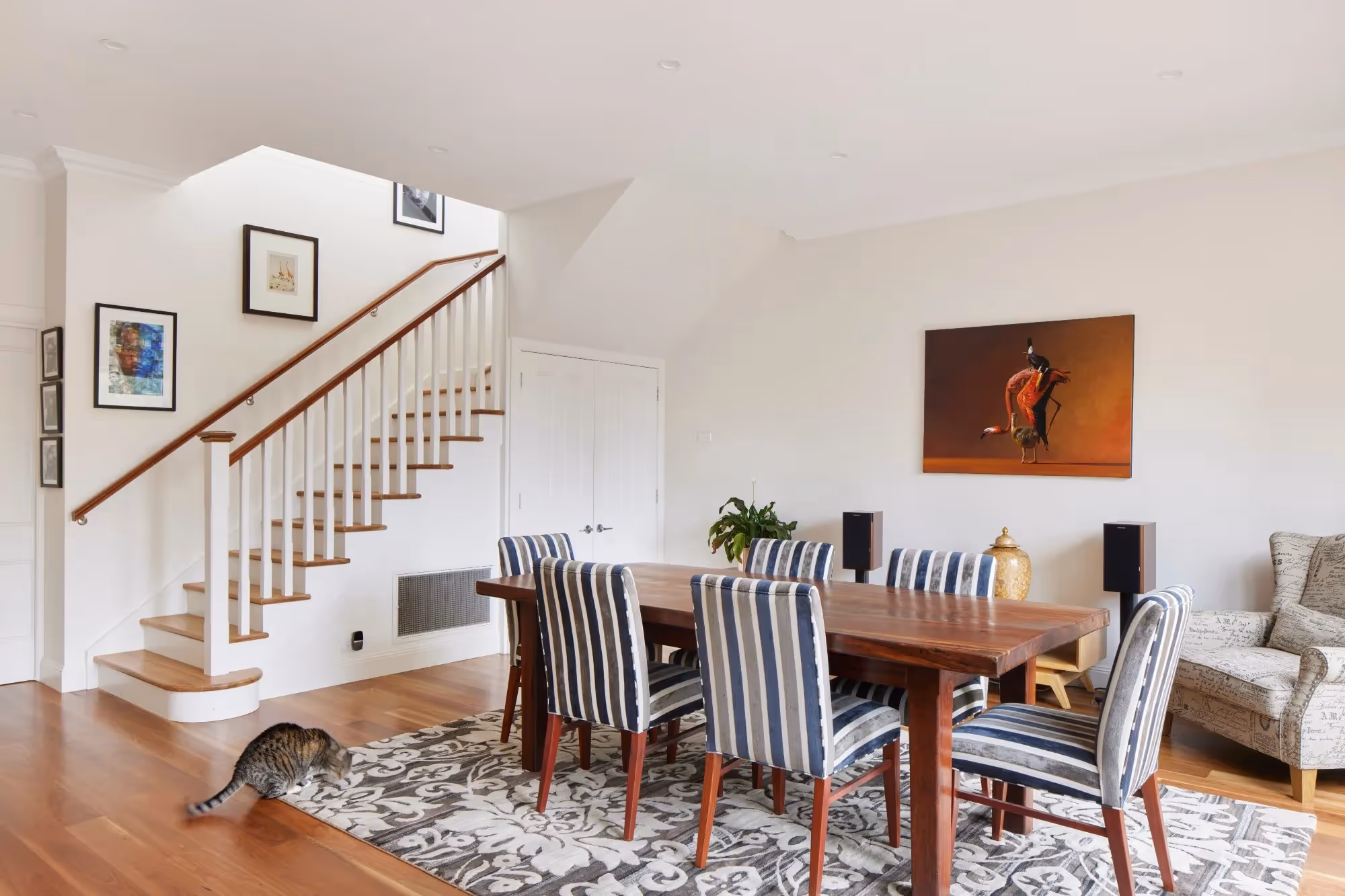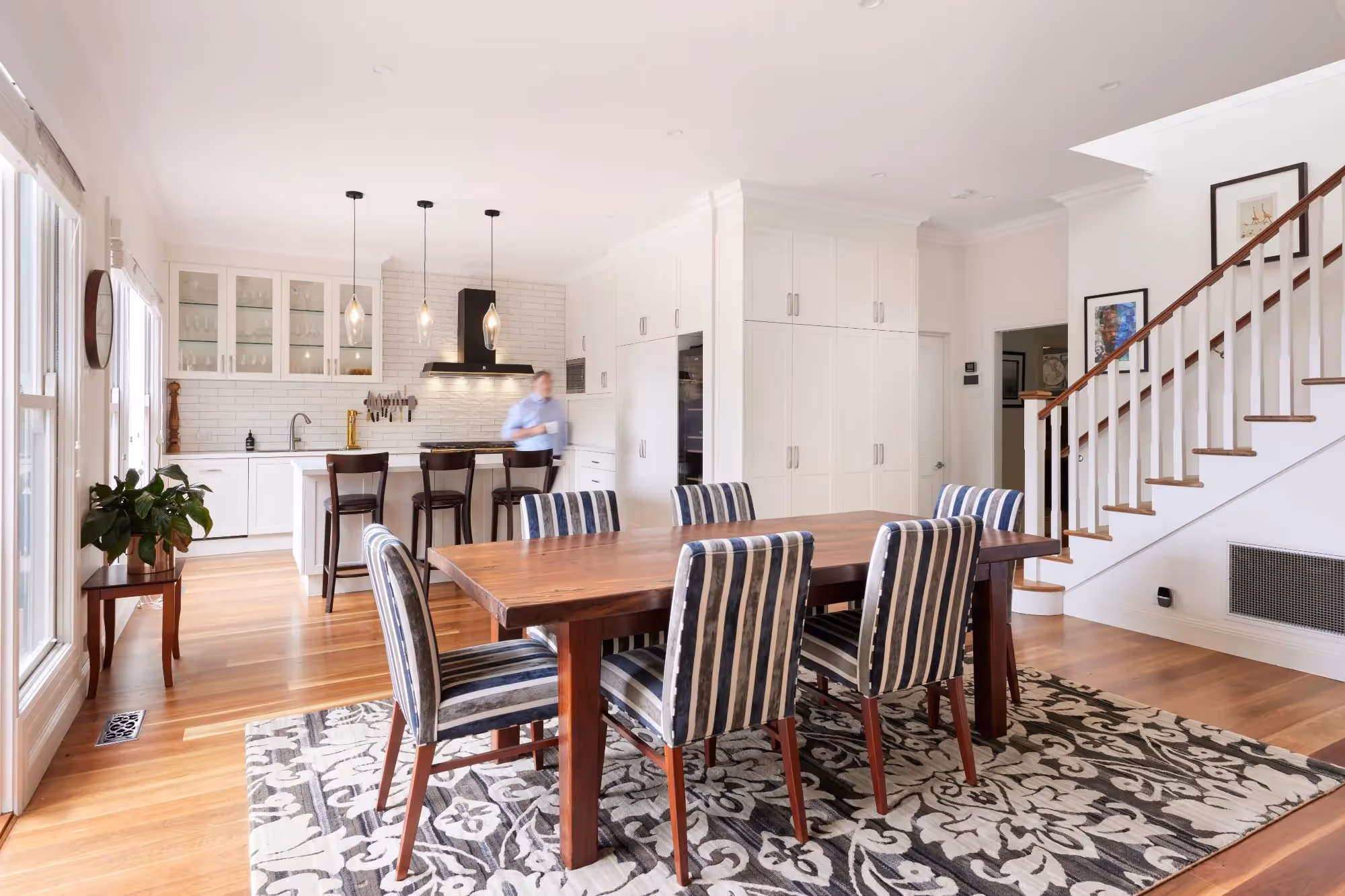 The expansive ground floor extension comprised of a new open plan kitchen, dining and living area; main bathroom and an inconspicuous European laundry hidden behind closed doors beneath the stairwell.The smart new floorplan and layout allowed for natural flow between existing and new spaces without having to modify or compromise any part of the original home.
