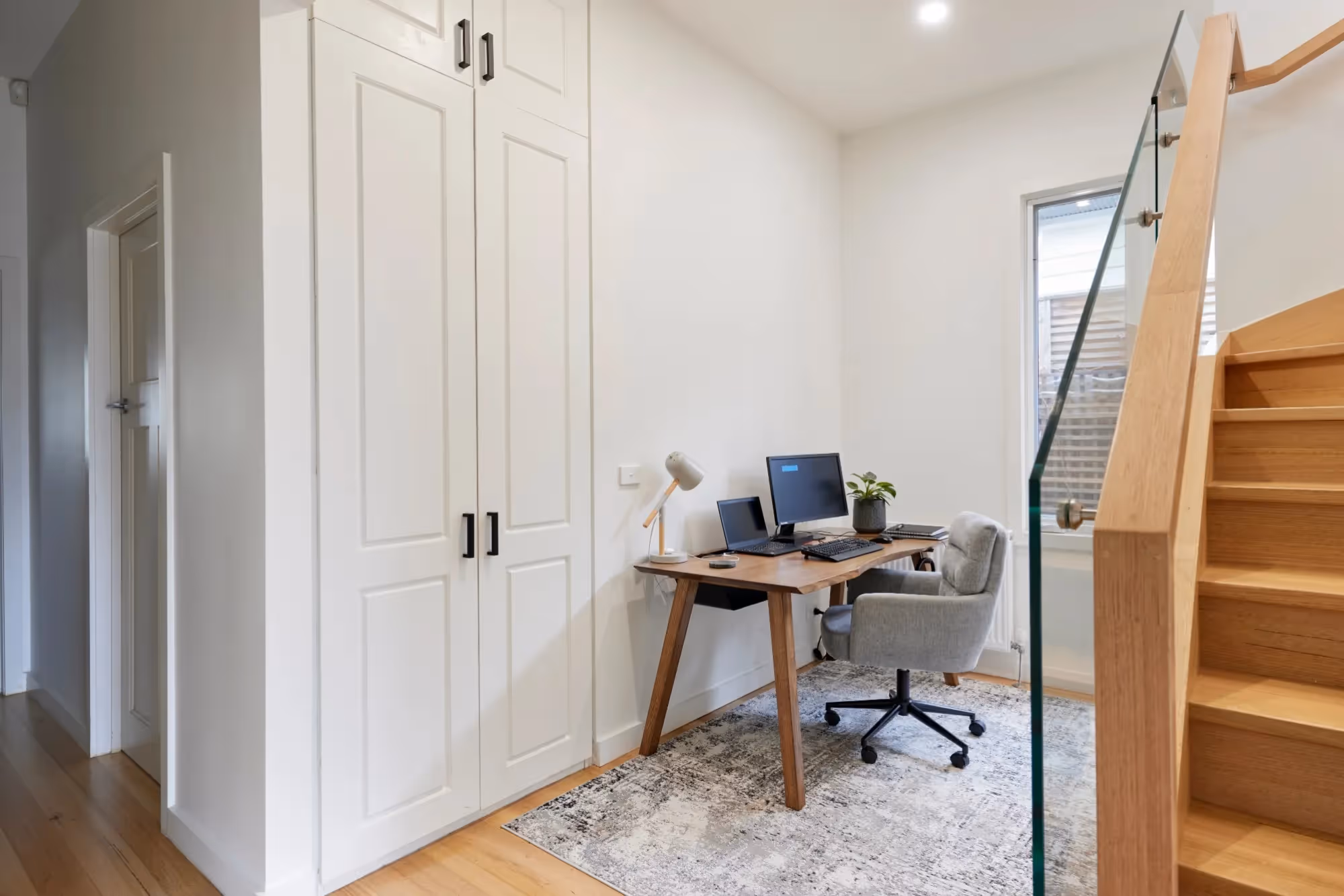On the ground floor one of the bedrooms was opened and converted into a study/home office and also made way for the stunning timber and glass staircase adding a fresh and airy ambience to the home whilst providing extra storage beneath.