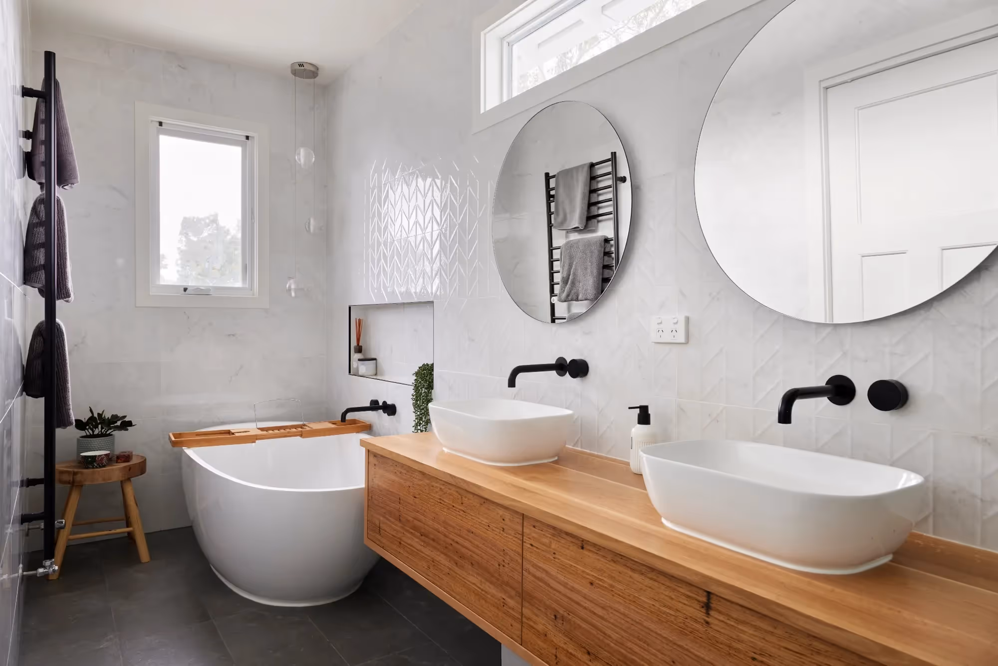 The result was a beautiful master bedroom with an expansive wall of Built In Robes, a stylish monochrome ensuite enhanced by the warmth of the timber vanity and a divine bathtub, a touch of luxury to soak and relax in at the end of day.