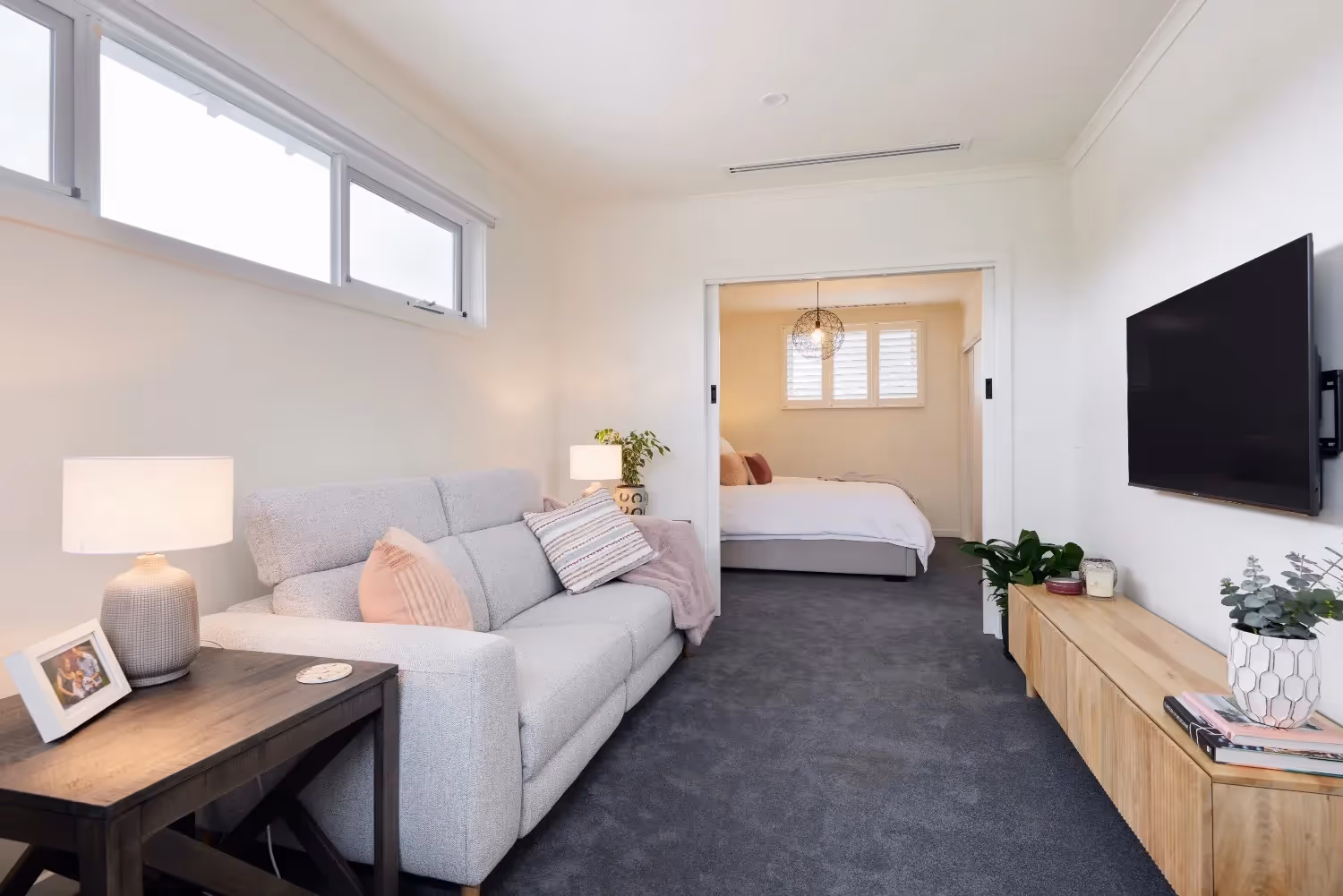 An added feature was a smart design to incorporate cavity sliding doors between the bedroom and living area that could be left open for easy living or closed for extra privacy.