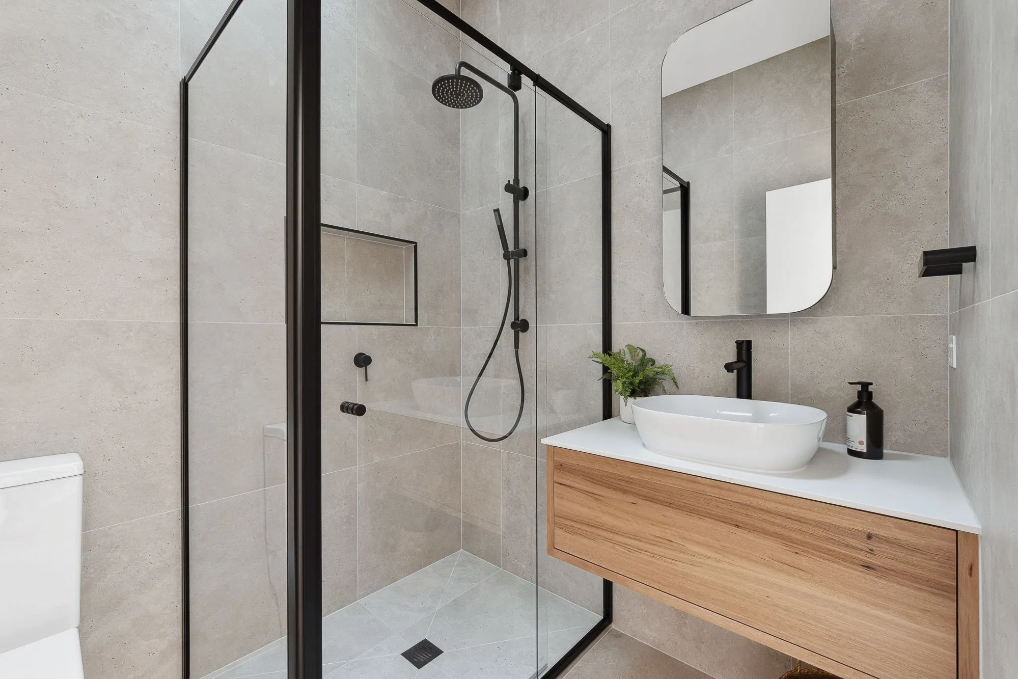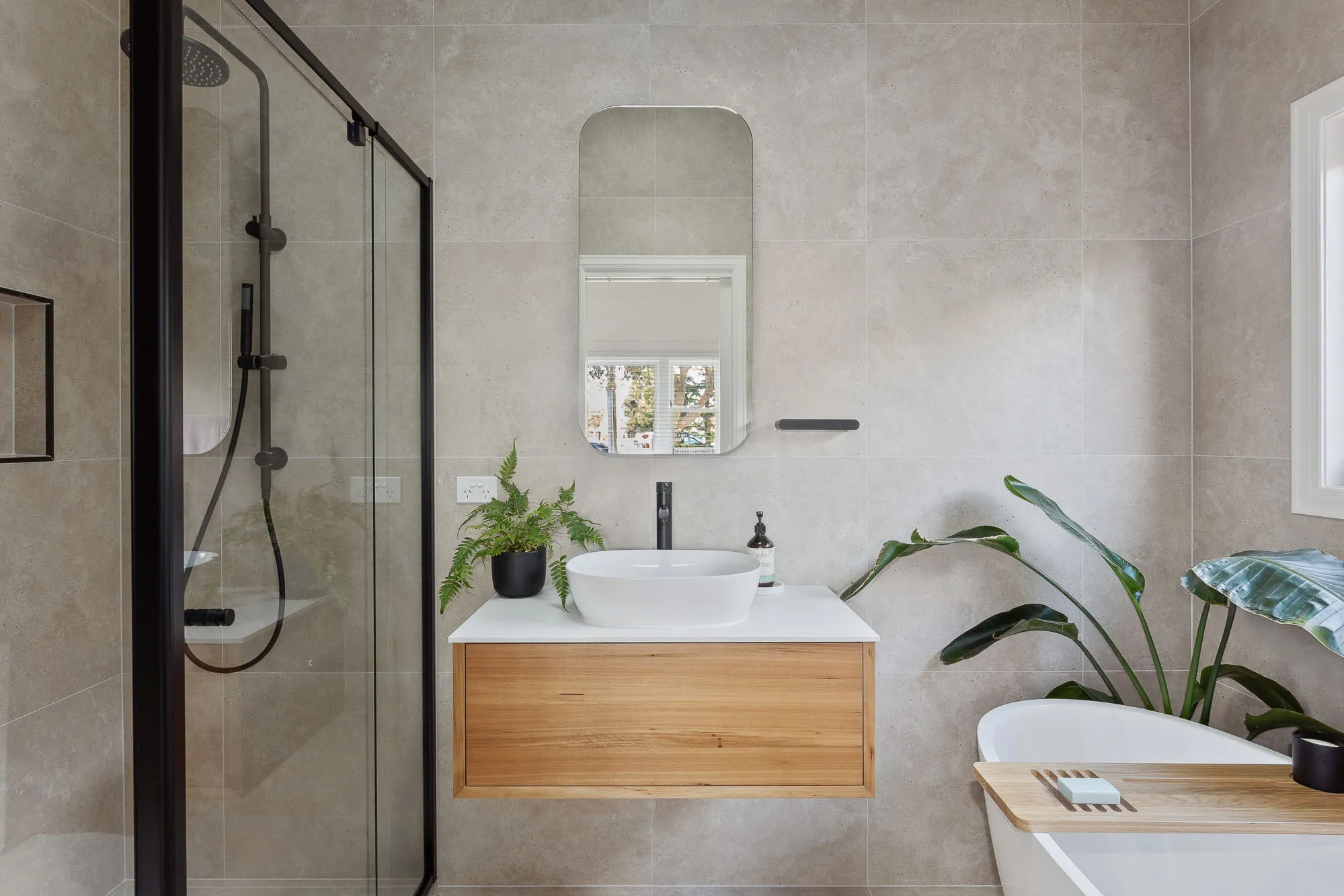 The main bathroom which flanked the front master bedroom was converted to an ensuite that was all about beauty and functionality. Travertine tiles in textured earthy tone adorn the floor and walls, a beautiful back drop for the floating timber vanity with its perched white basin and matt black accessories. And just for a touch of decadence, to wind down after a long day, a beautiful free-standing bathtub was added. Velux skylight was factored in the design to provide natural light and ventilation.