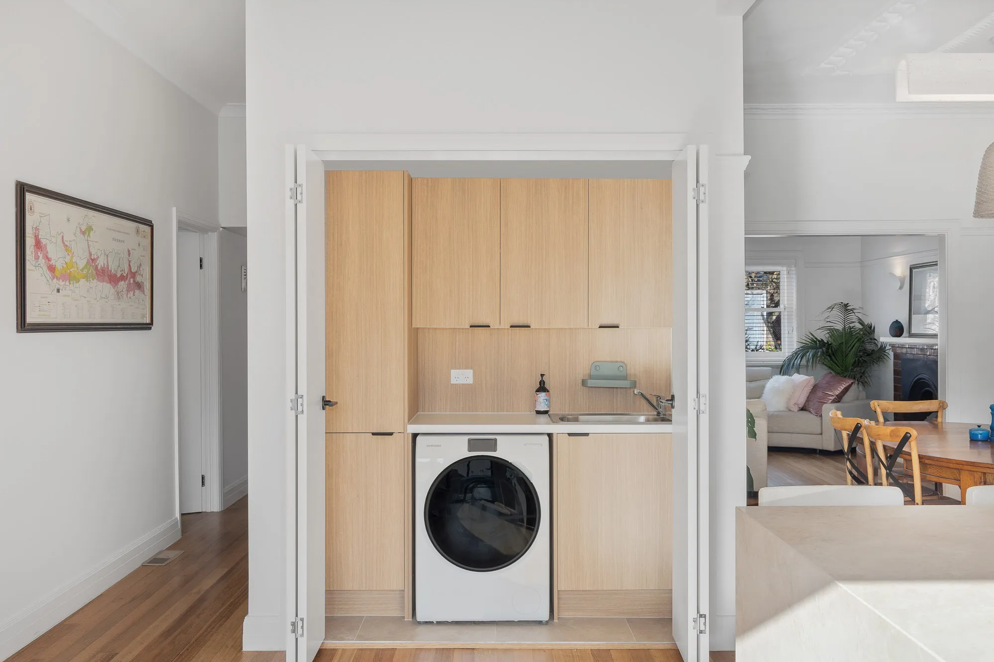 The old kitchen area made way for the new main bathroom, its aesthetics mirroring the style of the ensuite and a modern European Laundry with plenty of storage is hidden discreetly behind bifold doors.