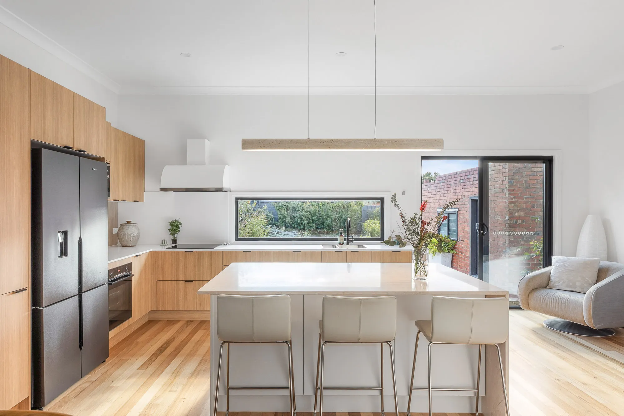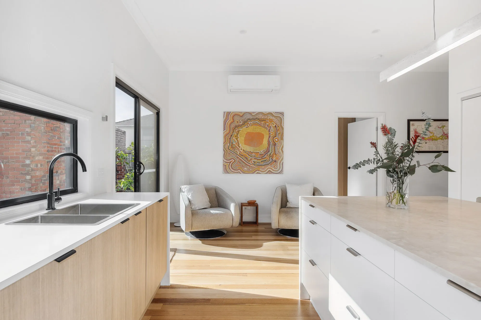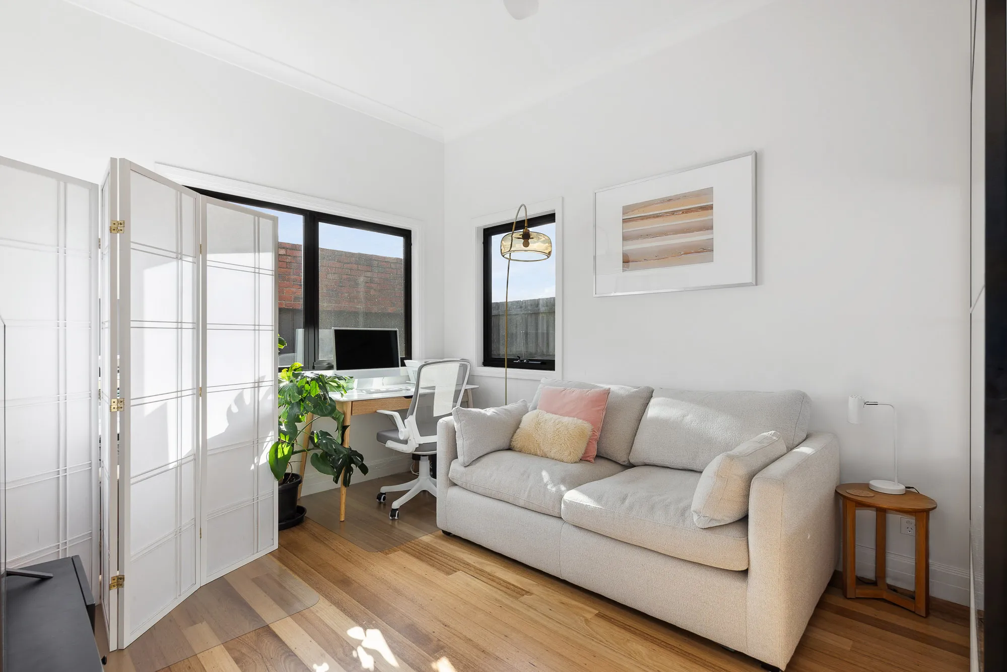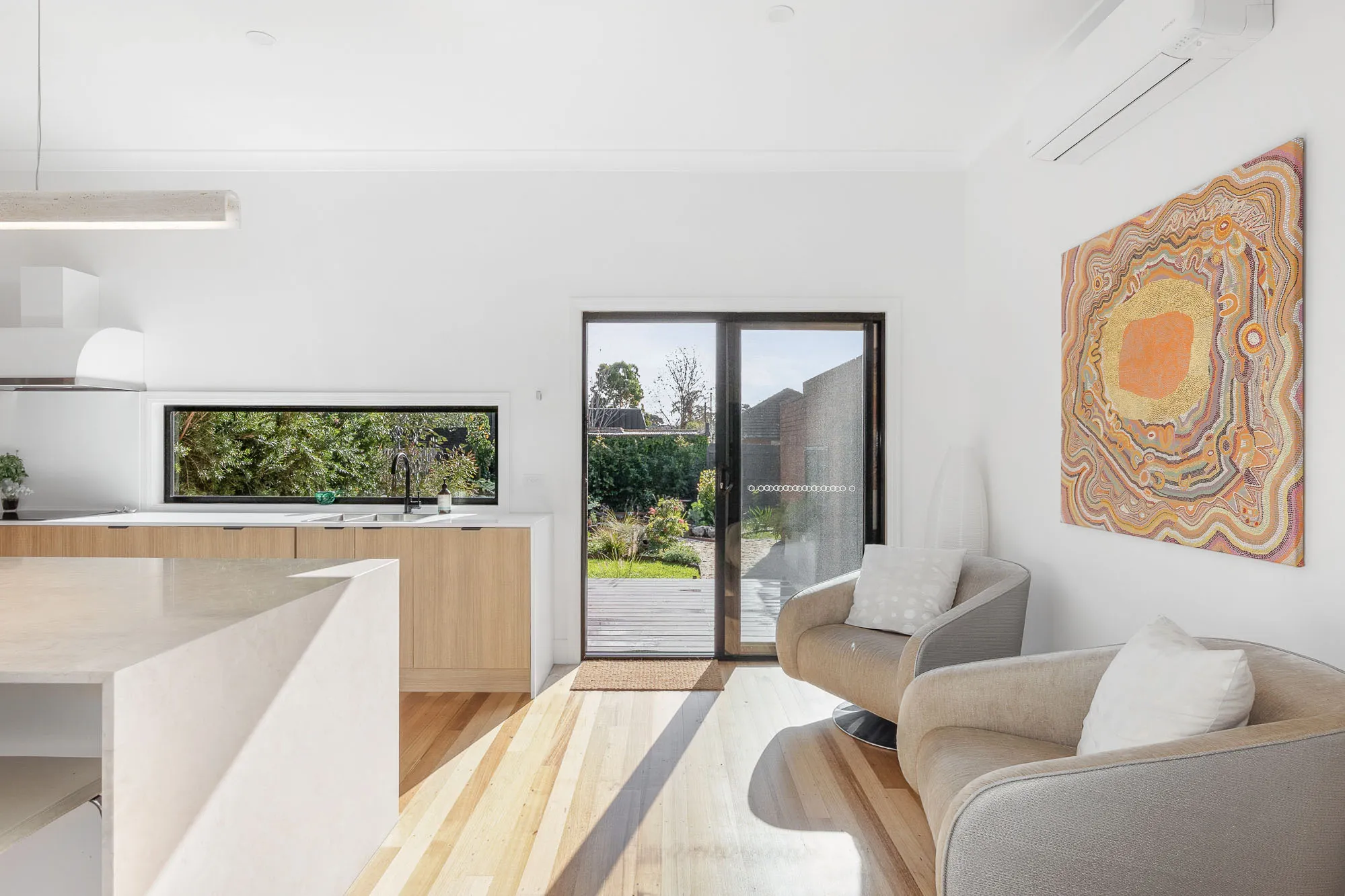 Taking full advantage of the northerly aspect, an expansive fixed window and sliding doors were added, the design providing an abundance of natural warmth and light to permeate the back of the home. Sunlit and with great views of the garden the new home office/ multipurpose room makes working from home or chilling with a good book so much more enjoyable.